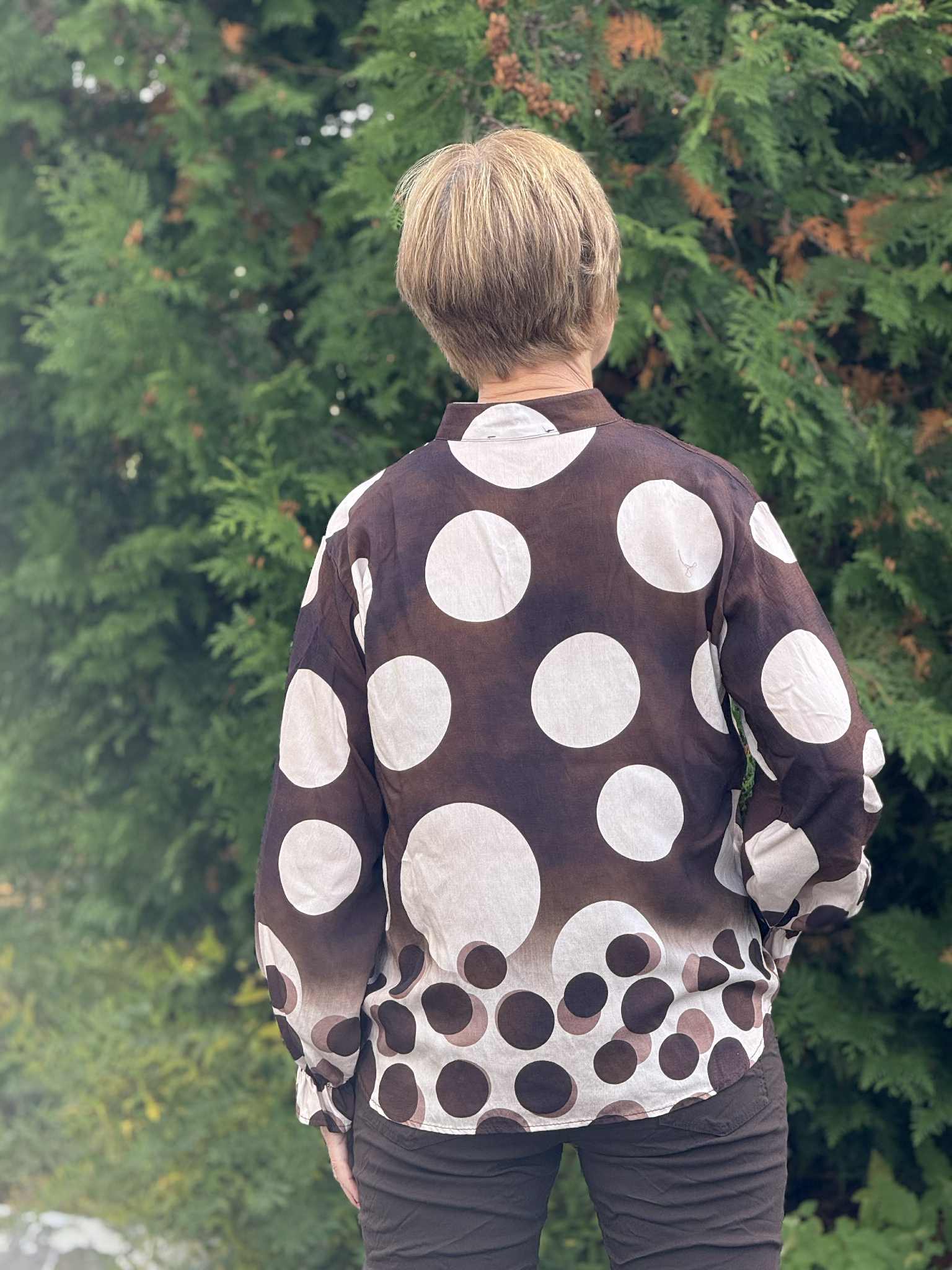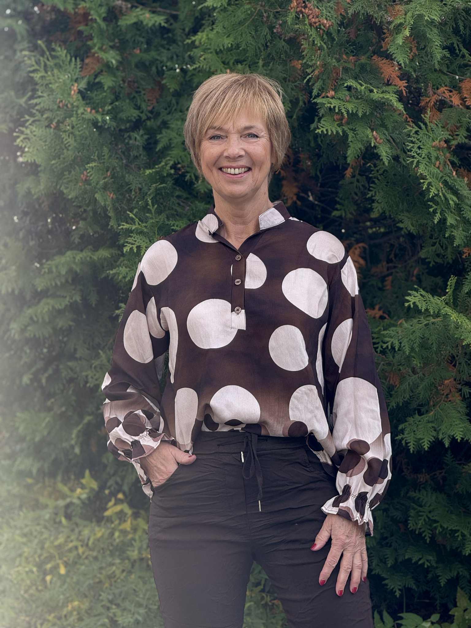 Bluse med gøyalt print, v-hals og knapper øverst.