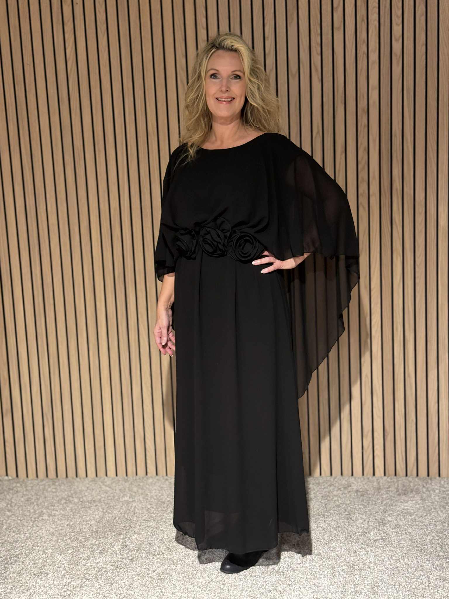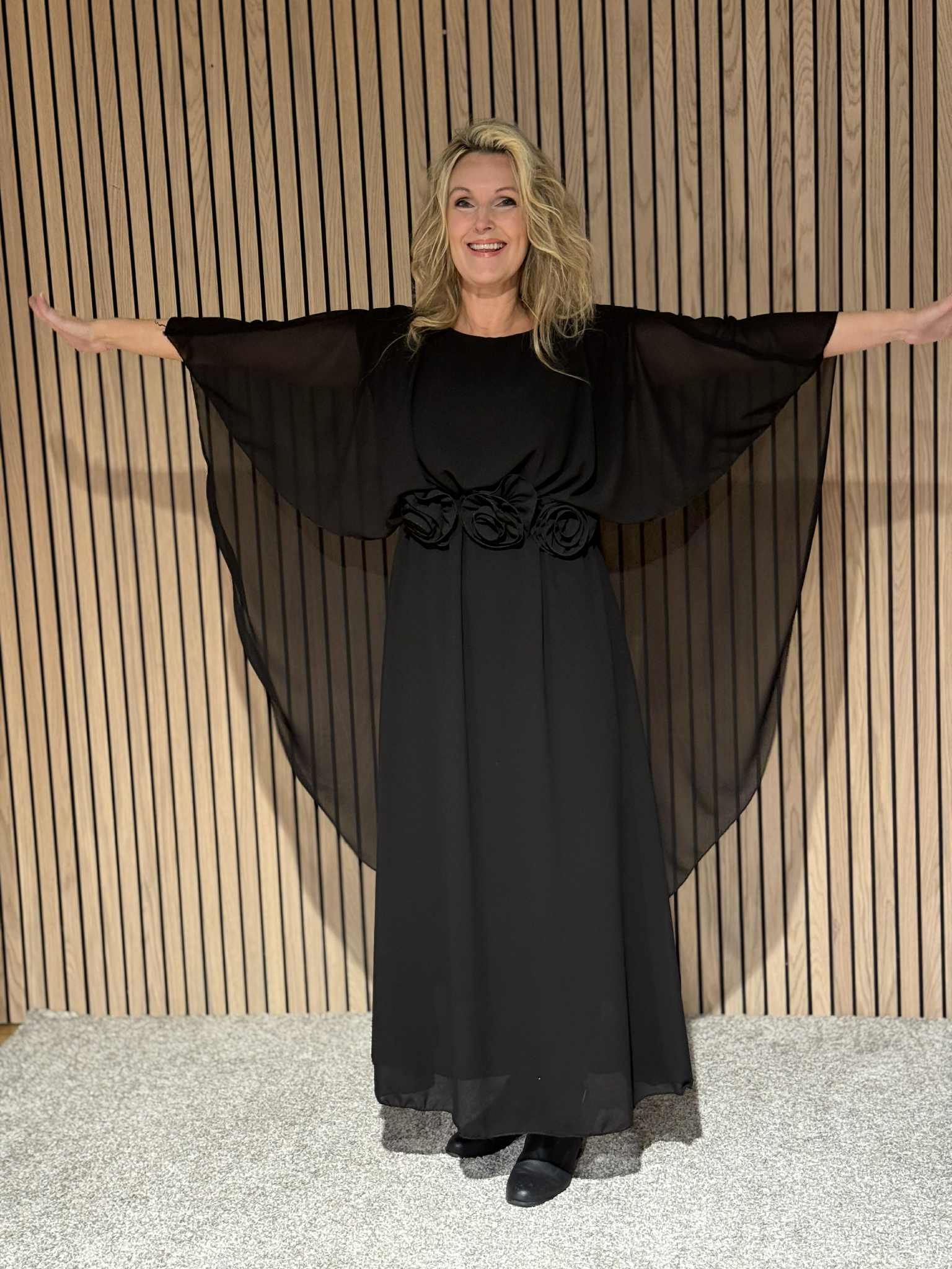 Elegant kjole som har et tidløst snitt og er pyntet med avtagbare rosetter,