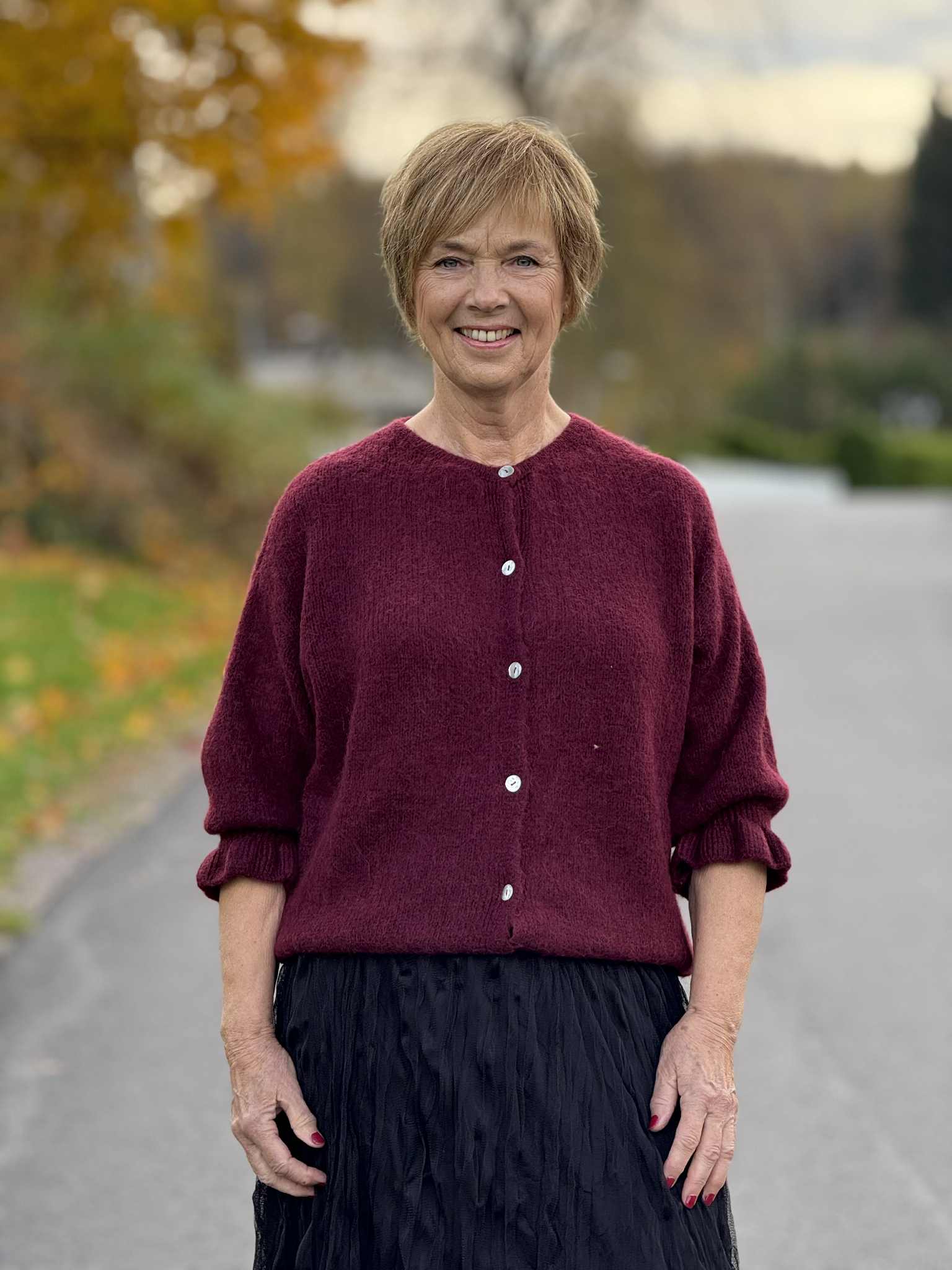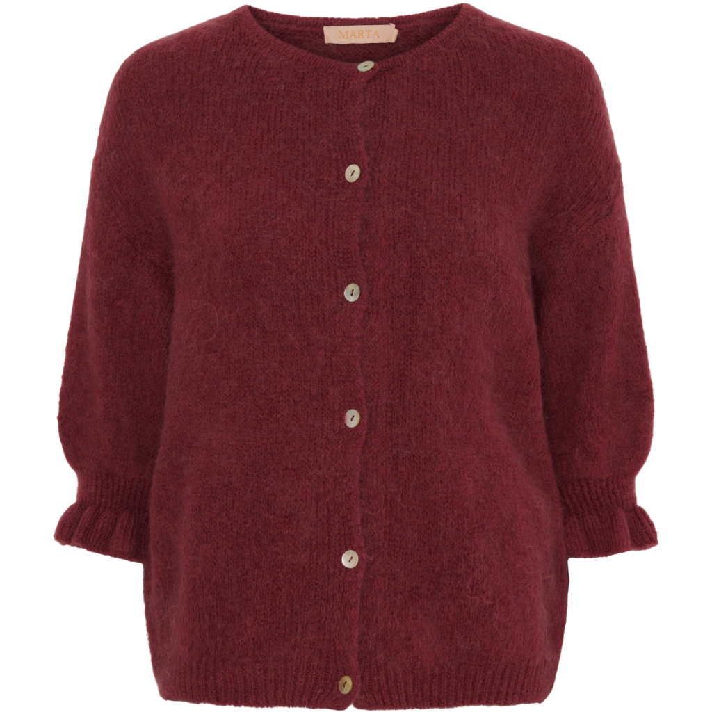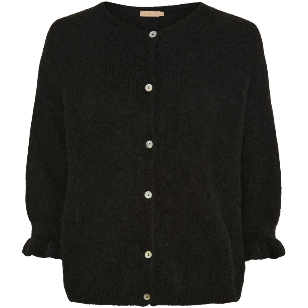 En nydelig cardigan med rund hals og knapper i front.