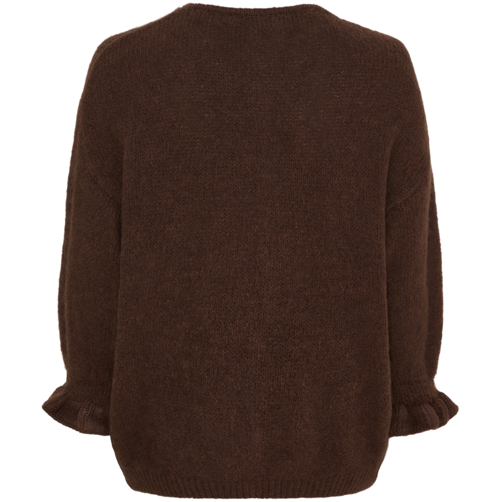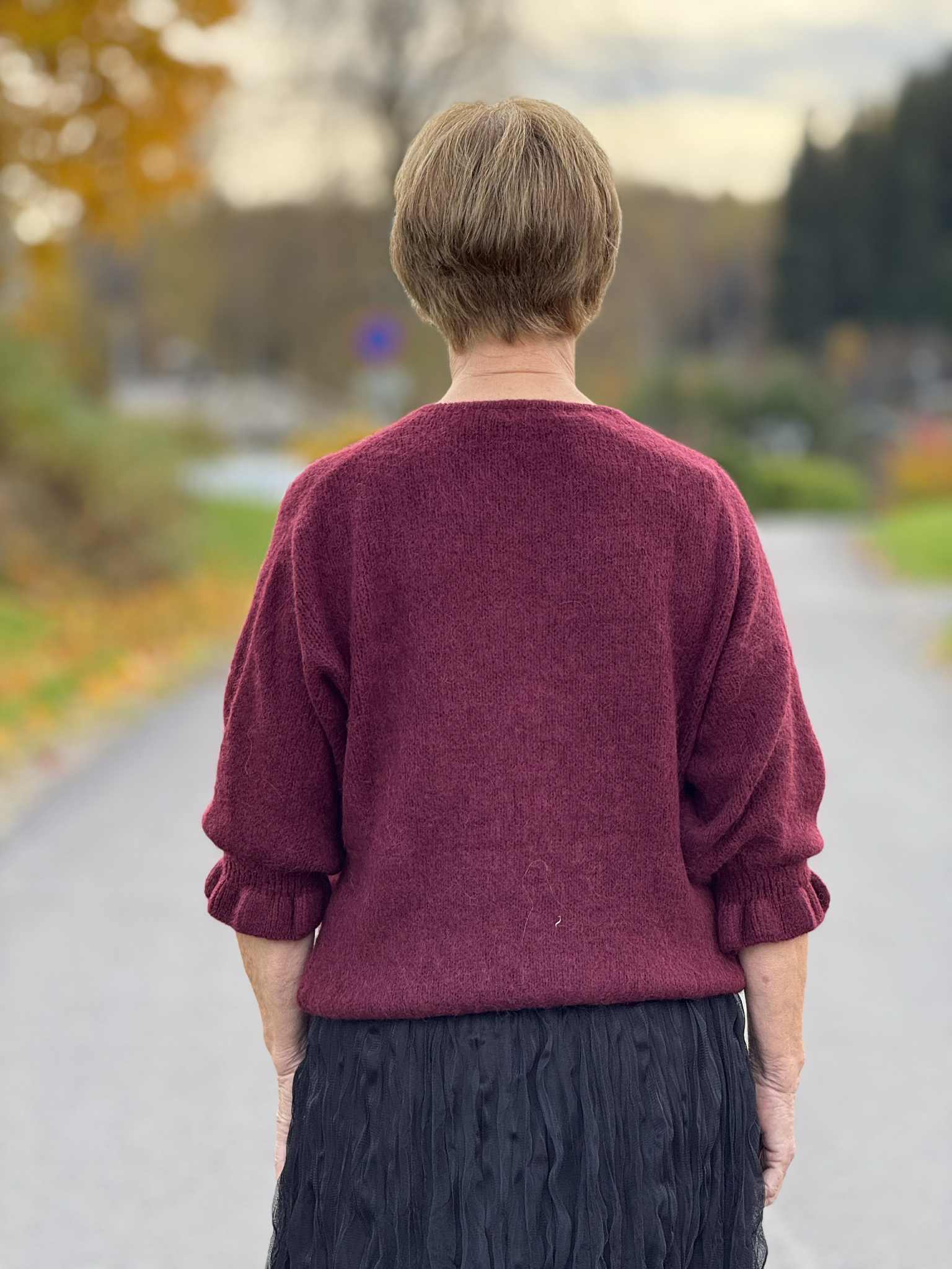 Den har 3/4 lange ermer med søt rysjekant og strikk. Like fin åpen som lukket.