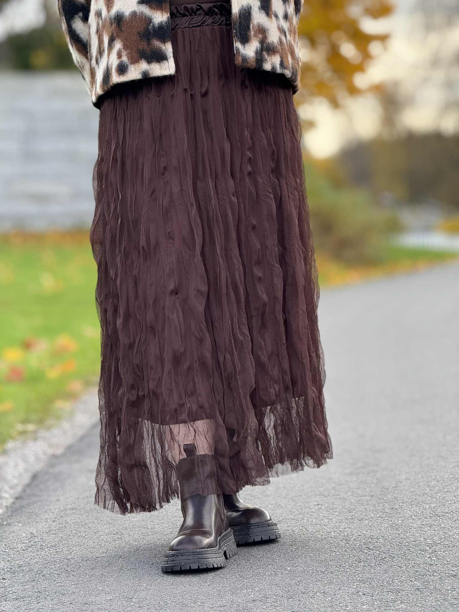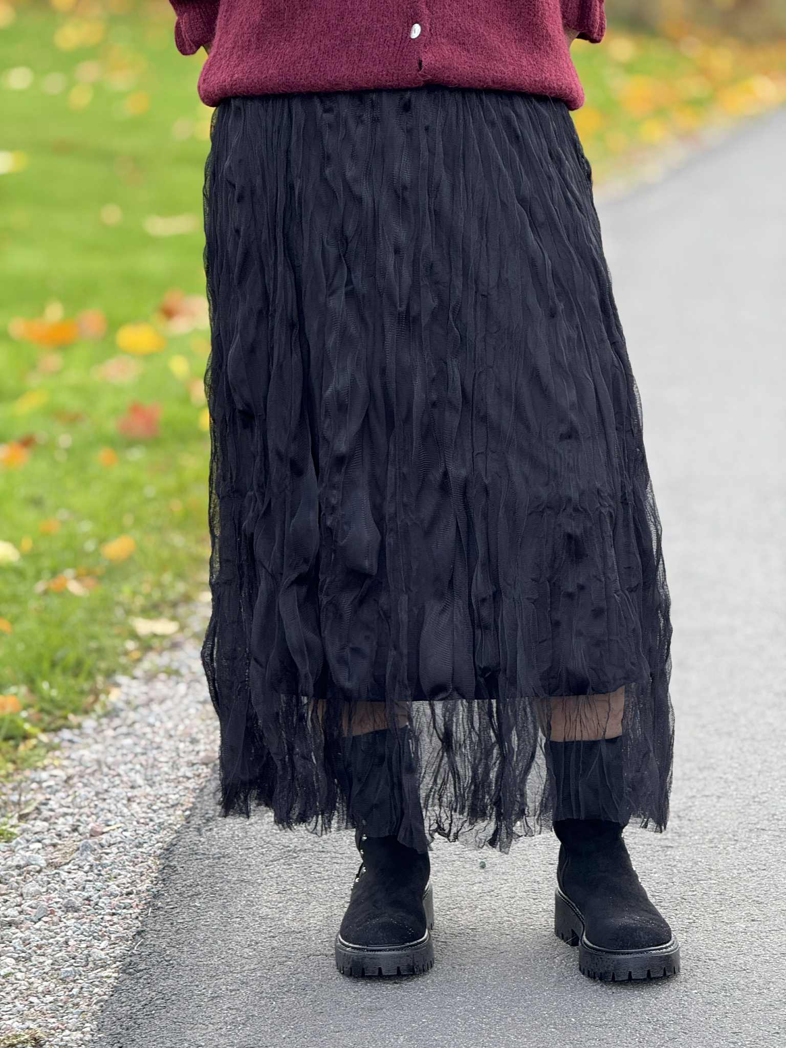Trendy og langt tyllskjørt med strikk i livet.