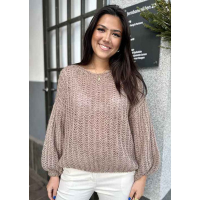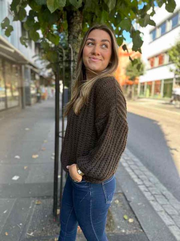 har en løs strikk nederst på genseren.