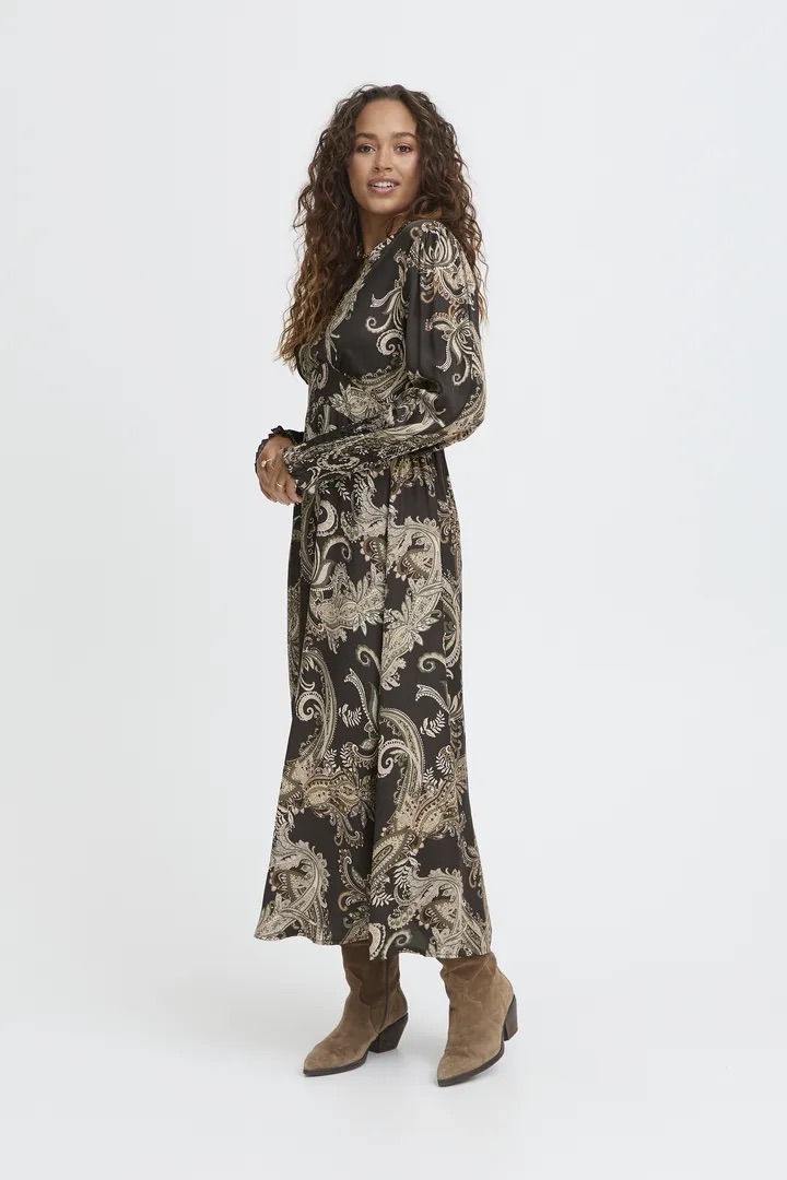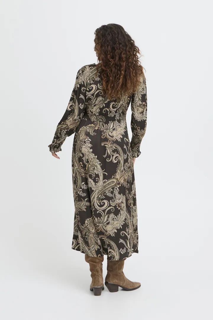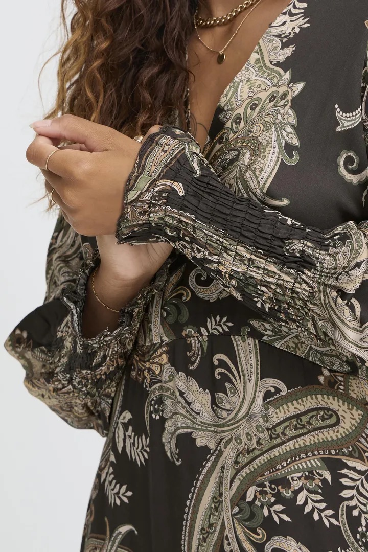 Elegant kjole med paisleyprint i sateng/viskosekvalitet og så fint snitt.