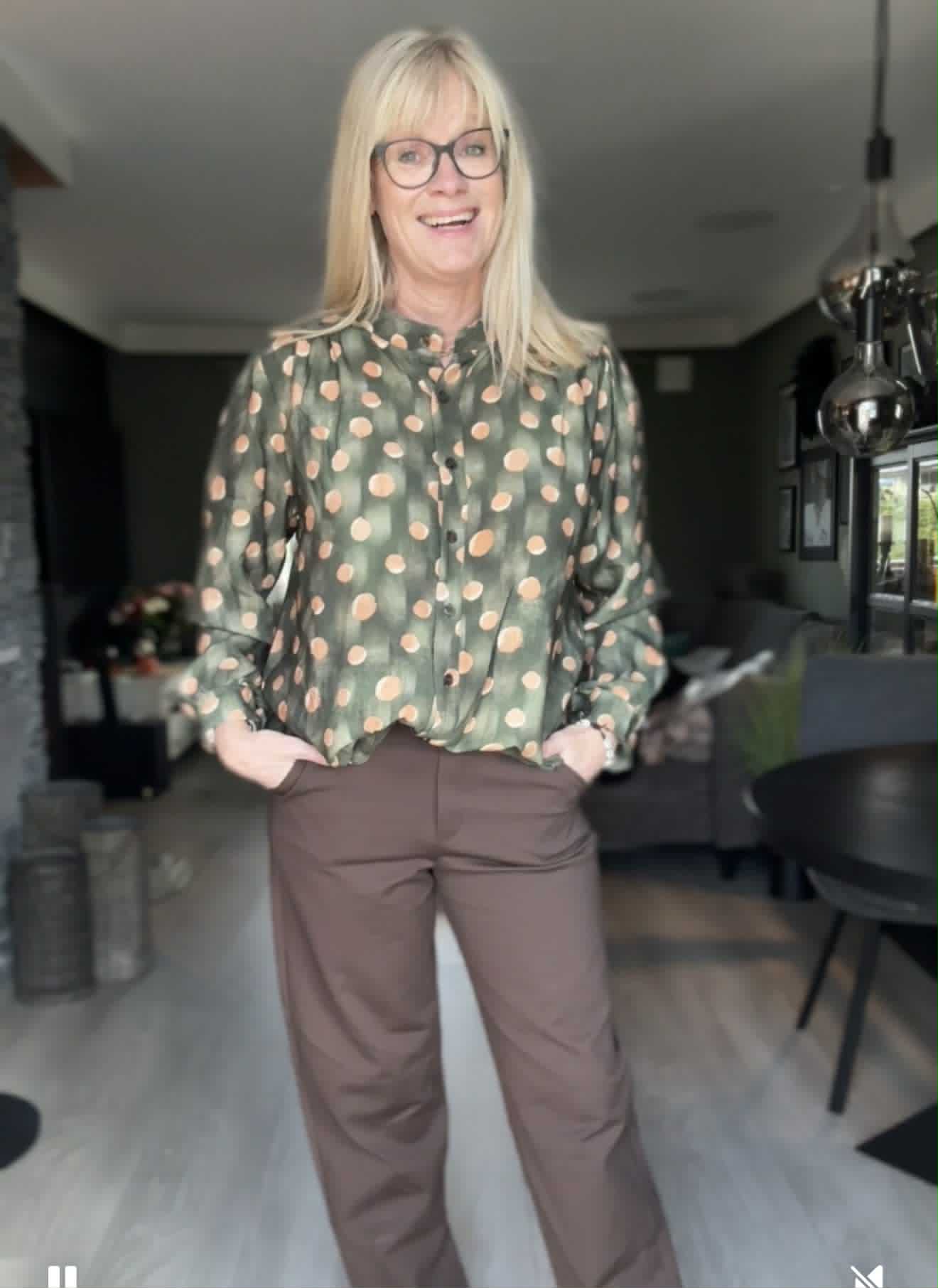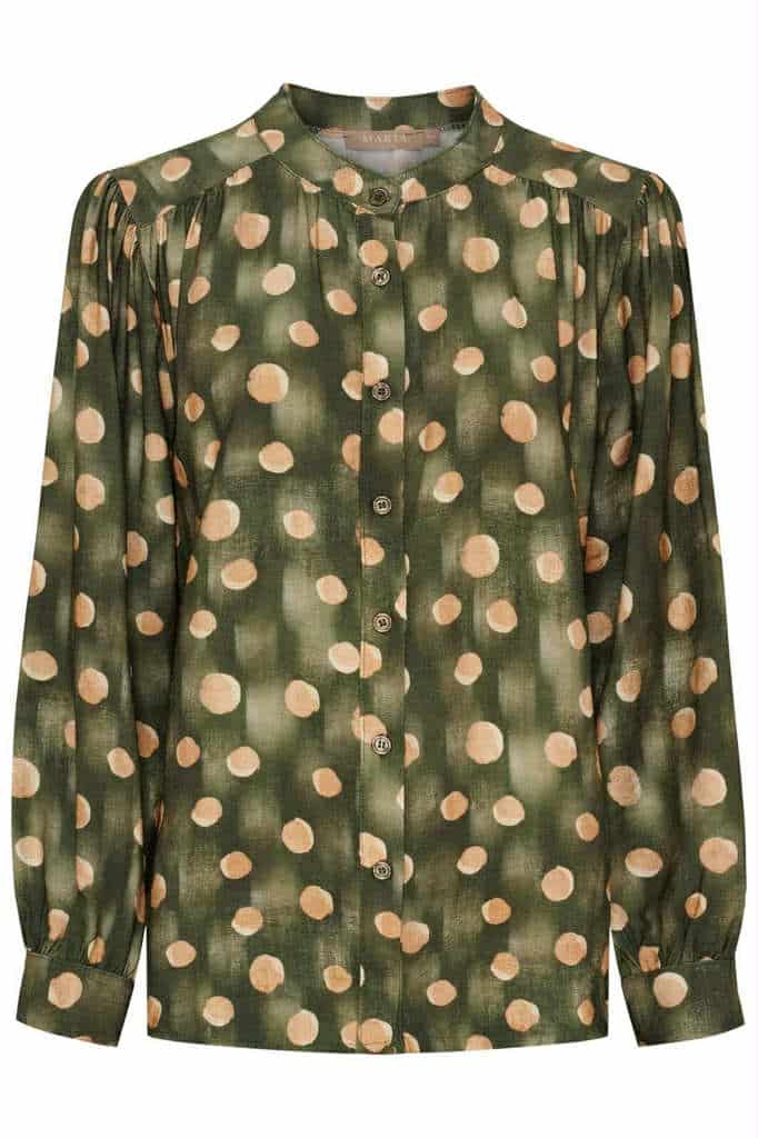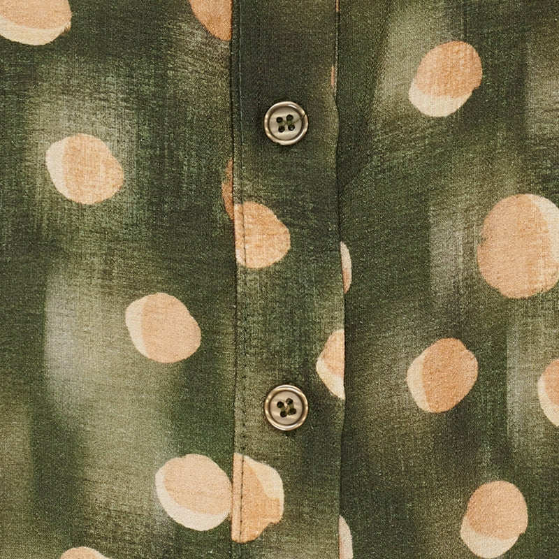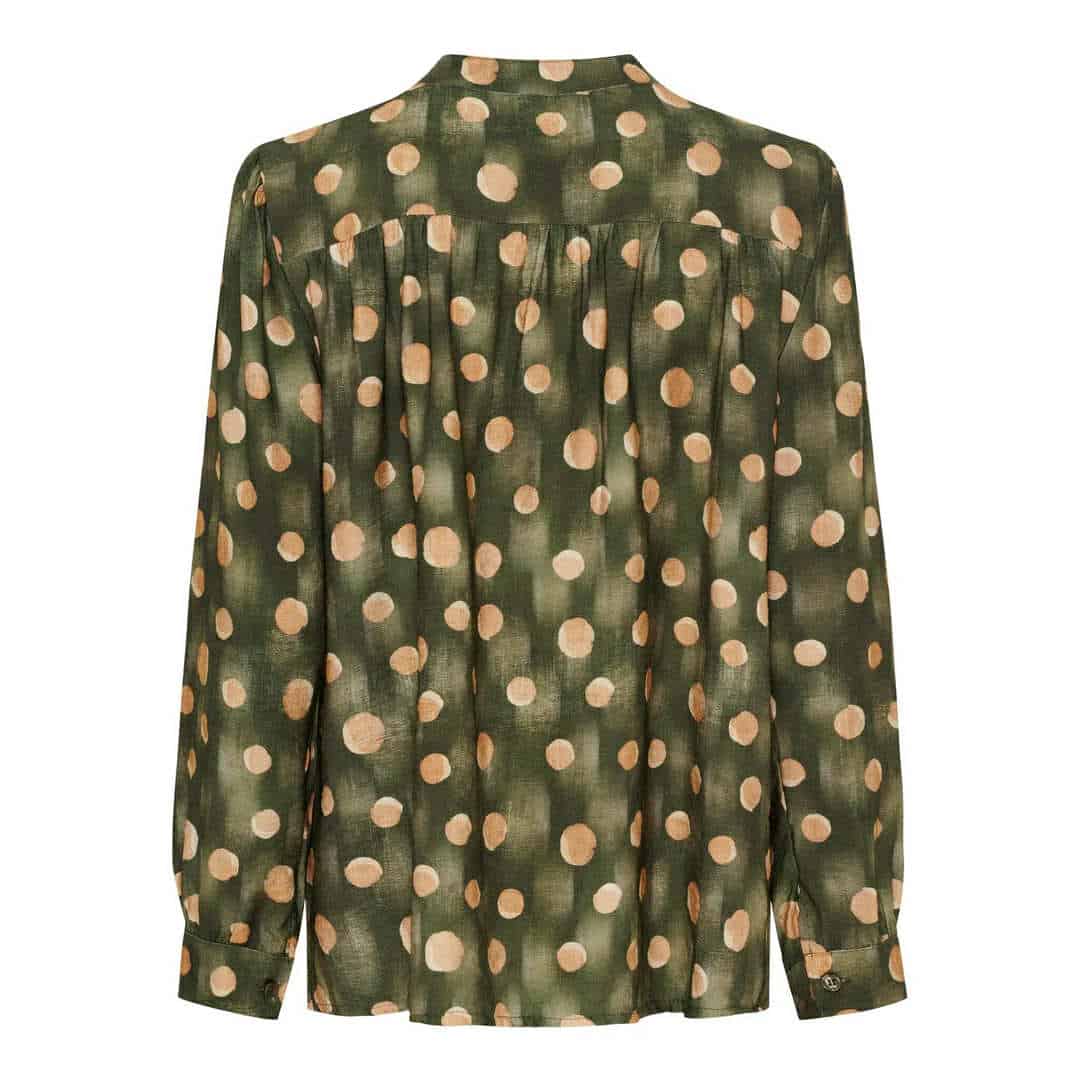 Bluse i miliærgrønn med duse fine polkaprikker.