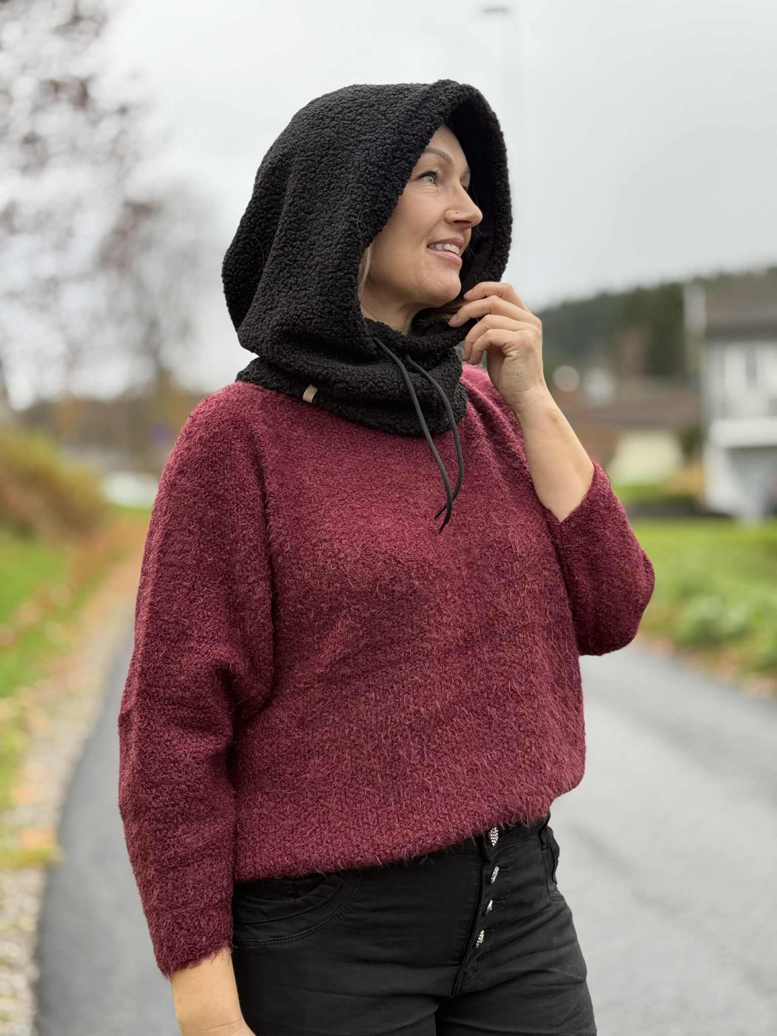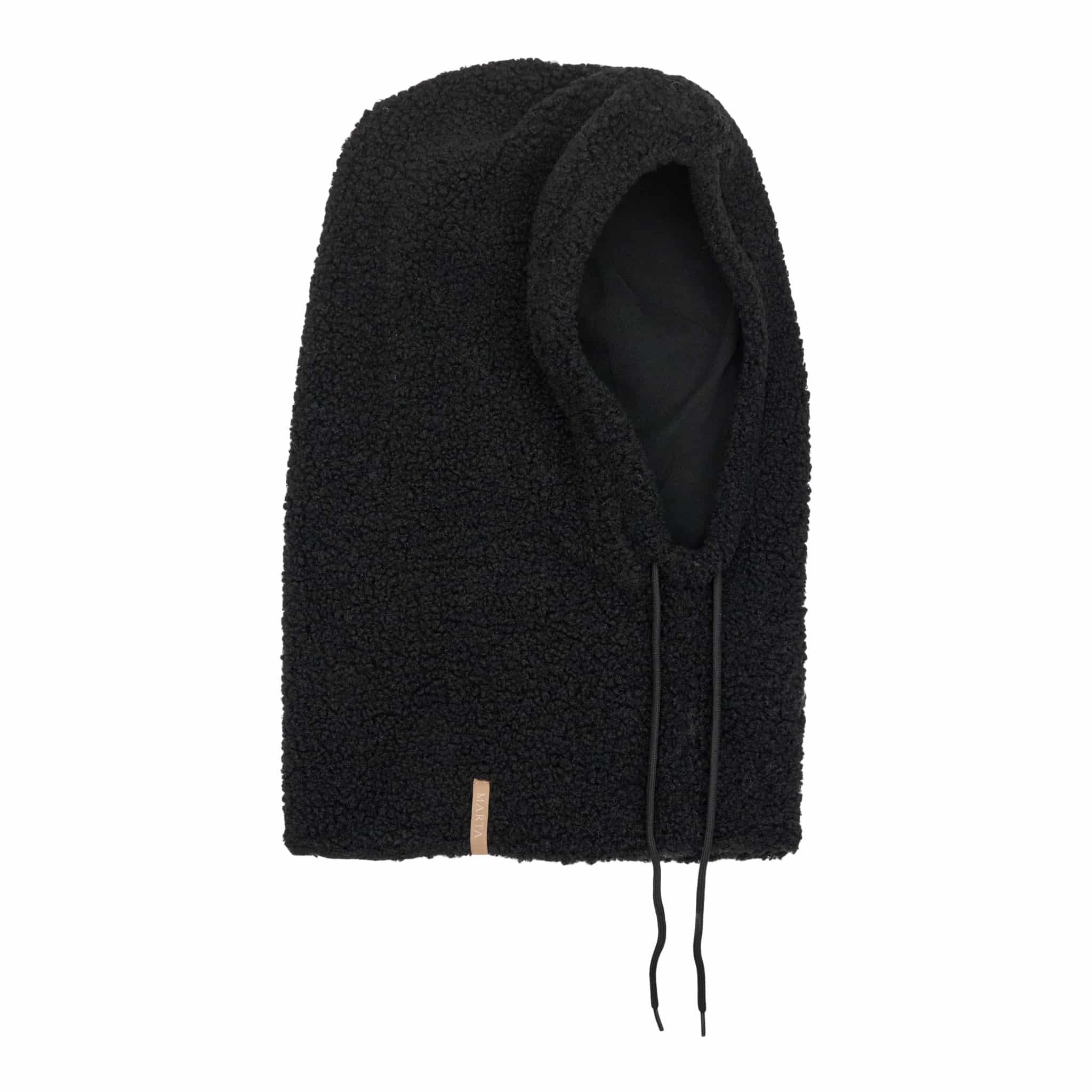 Balaklava med en fluffy og myk overflate. Den har en praktisk snor i bunnen