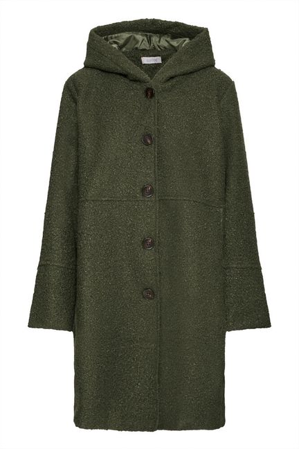 Den har en fin lengde til midt på låret, knapper i front og hette.